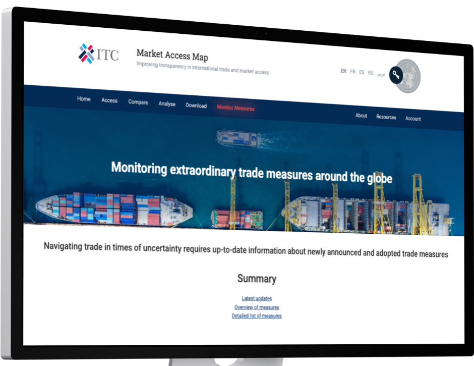 Through the Market Access Map tool, the Monitor Measures module closely monitors recent extraordinary trade measures introduced by major economies such as the United States, the European Union, and China, among others. These developments are analyzed and mapped to ensure MAT tools’ users remain informed about the latest tariff changes.