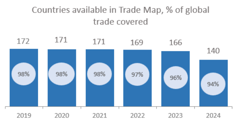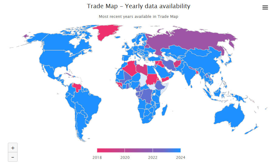 Trade Map is updated weekly to include the latest figures reported by national authorities. With data now available for 75 countries for the second quarter of 2025, Trade Map remains one of the most comprehensive and up-to-date global trade databases. |